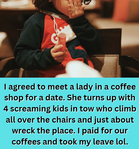 The nightmare isn’t that she has kids — it’s that this was never mentioned. No warning, no heads-up, no attempt to manage the situation. He pays for the coffees like a gentleman and exits calmly, knowing there’s no version of this date that recovers. Sometimes the only win is leaving early with your sanity intact.