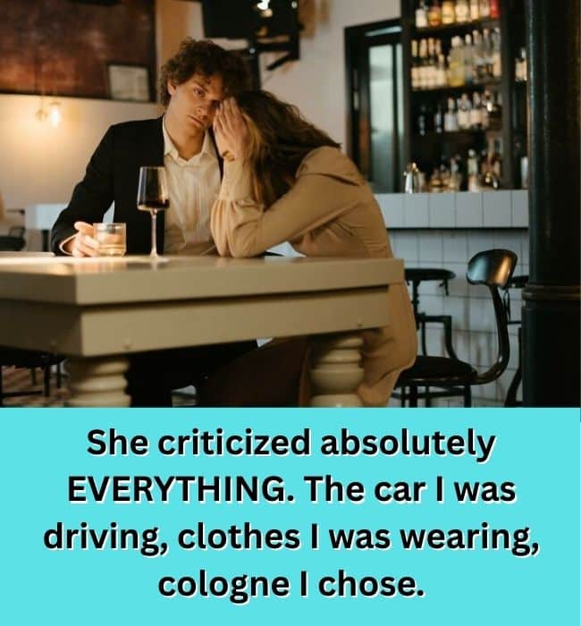It doesn’t explode — it erodes. Comment by comment, she dissects everything: the car, the outfit, the cologne, the choices. Nothing is outright cruel on its own, but stacked together, it becomes a slow-motion teardown.