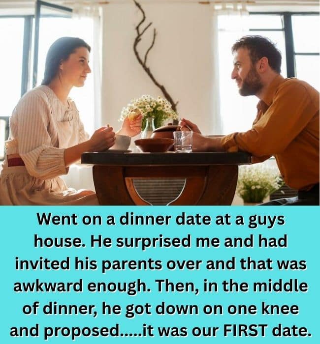 Mid-meal, he drops to one knee. No history. No relationship. Just confidence and a ring, apparently skipping several critical steps. From the outside, it’s less romantic and more alarming — like watching someone fast-forward through an entire life plan with a near stranger trapped at the table. The date doesn’t end in love, just stunned silence and a story that will never stop being told.