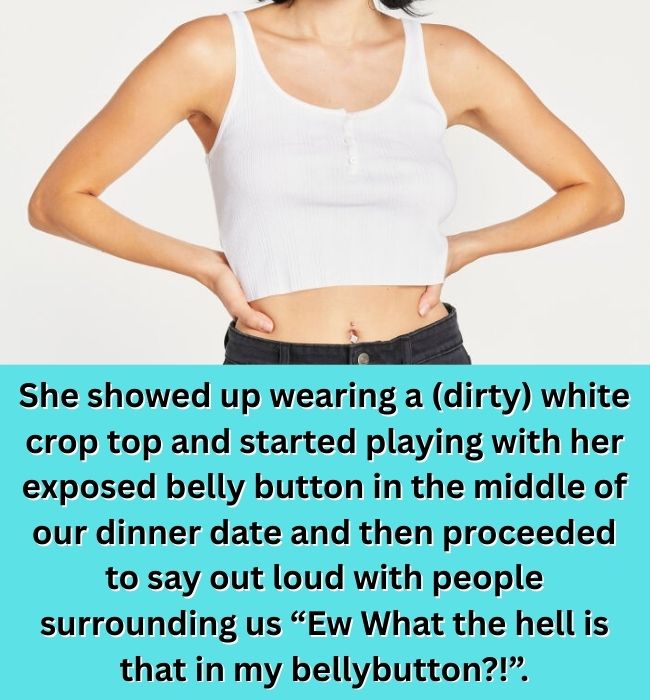Then she says it. Loudly. In a packed restaurant. “Ew, what the hell is that in my belly button?” Forks pause. Nearby tables clock in. Any remaining illusion of romance evaporates on the spot. From the outside, it’s less a date and more a public health announcement no one consented to attend.