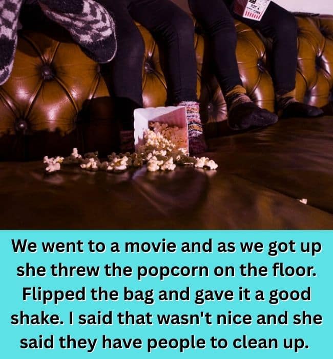 The movie ends, people stand up, and that’s when she makes her move. She flips the popcorn bag upside down, shakes it for good measure, and scatters it across the floor without hesitation — like this is part of the exit routine.