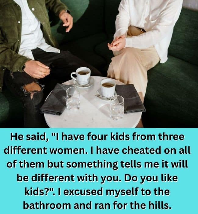 The date is moving along until he decides to unload his life résumé in one breath. Four kids. Three women. Cheated on all of them. No shame, no pause — just a sudden pivot to optimism, capped with “but it’ll be different with you,” like that’s a reasonable conclusion.