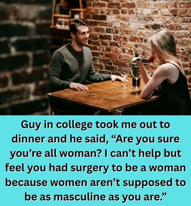 The date is already uncomfortable when he decides to say the quiet part out loud. He asks if she’s “all woman,” then doubles down by suggesting she must’ve had surgery because, in his mind, women aren’t supposed to be as “masculine” as she is.